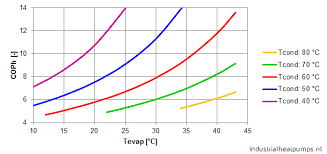 Ammonia, for example, is a very efficient refrigerant with a COPh of 6 for a evaportion temperature of 30 °C and condensation temperature of 70 °C. These same conditions only give a COPh of 4,5 for refrigerant R134A. Other factors that will effect the efficiency of a heat pump are system controls, efficiency of pheripheral equipement like fans, pumps, etc. The theoretical maximum efficiency of a heat pump is described by the Carnot-efficiency: The equation shows that the Carnot-efficiency depends on the condensation and evaporation temperature. With an ideal compression cycle without losses it is possible to achieve the Carnot efficiency. However, in practice there are a lot of parameters that have a negative influence on the efficiency. Therefore the real COPh is given by the product of the Carnot efficiency and the system efficiency: The system efficiency is usually 50% to 70%. With a transcritical heat pump the Carnot-efficiency can not be used, because there is no condensation temperature, but a temperature range in the gas cooler.