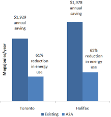 What Does it Save? The cost savings associated with the replacement of a conventional furnace with air-to-air heat pump is dependent upon a number of factors including the efficiency, condition and location of the original equipment, energy type and cost, and the climatic region. Here is an example of the possible savings a family of four could see with an ENERGY STAR-rated air-to-air heat pump. The example family lives in a 2-storey house built in 1973. The air-to-air heat pump in this example is a 13 kW all-electric unit with a HSPF of 10, and ties into the existing ductwork for a forced-air system. It replaces a mid-efficiency gas or oil furnace, or electric baseboard. In regions where the current cost of natural gas is low and that of electricity is high, the savings are shown as negative, meaning it would cost more to run the heat pump through the winter than a gas furnace. However, the heat pump could supply air conditioning at a much lower cost, resulting in a net annual cost saving.